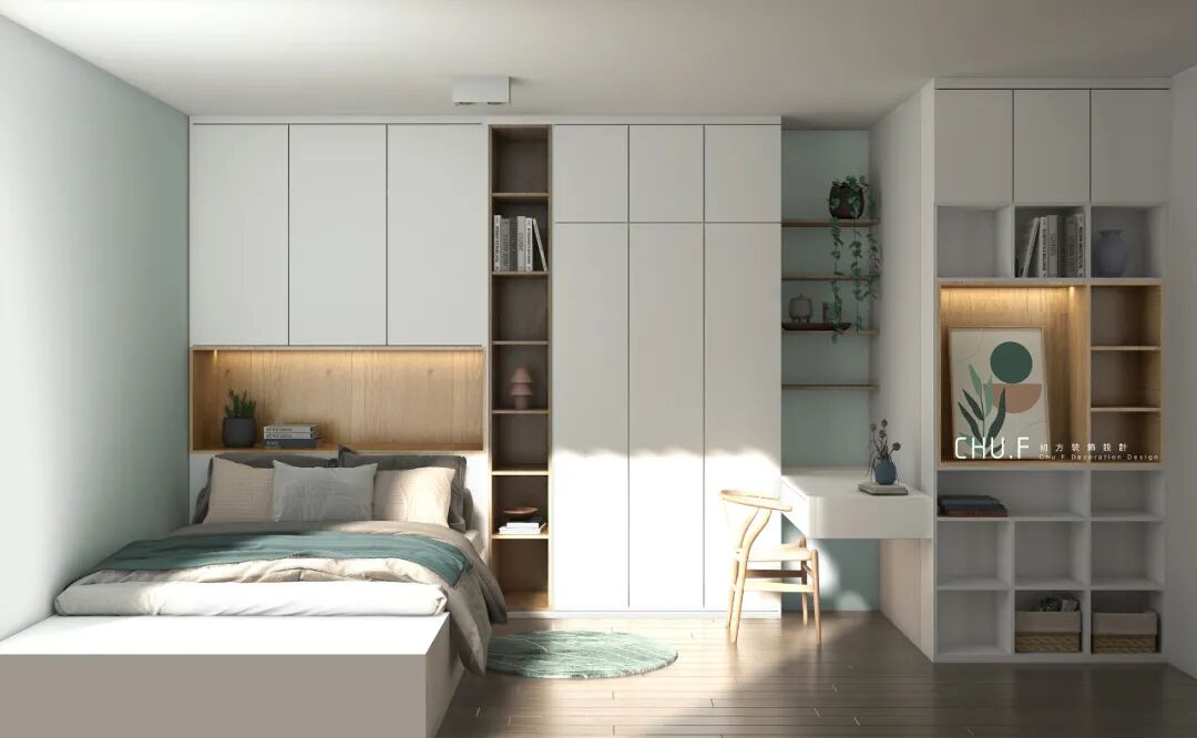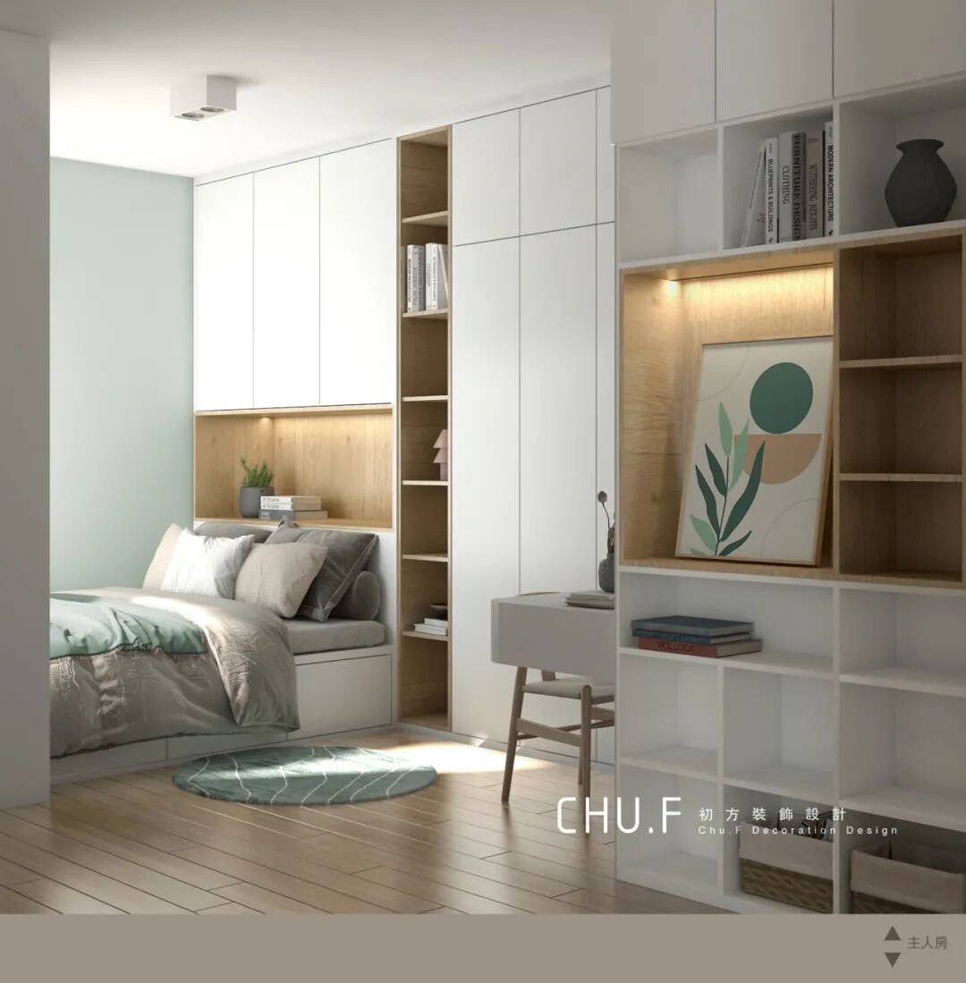 主卧,进门就是一整面书柜,仿佛置身于图书馆,静谧柔和。榻榻米床榻大大增加其收纳的需要,也是对空间的充分利用。L型的一体式大收纳柜+书桌,满足了衣服的收纳,同时男主人还拥有了自己的办公区域,两全其美。空间布局流畅,活动区域没有死角,完美。木色地砖,搭配轻松静谧的灰色调,给起居室带来了一份恬静安好。