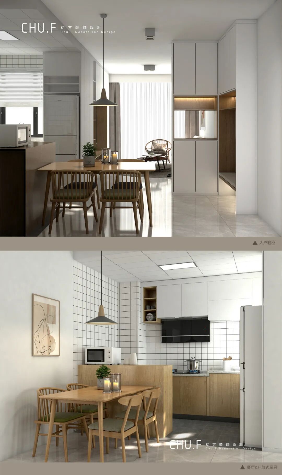 一进门就能看到L型的鞋柜,方便换鞋和收纳,下班回家陈列整齐,干净利落。进门左手边就是一个宽敞明亮的开放式厨房,吃饭,烹饪,互动两不误的空间。增设了一个吧台,岛台两用过的台面,提高了厨房的使用率,给生活带来了许多惊喜和便利。