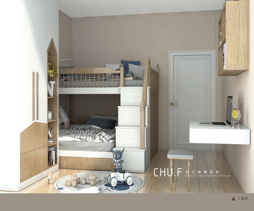 儿童房上下床横竖错开摆放,增加了侧边的收纳储物功能。空间以暖色调为主,想要给宝宝营造一个温暖而朦胧的氛围,大大小小的细节都能契合生活,不需要过多的点缀,简单纯粹很重要。