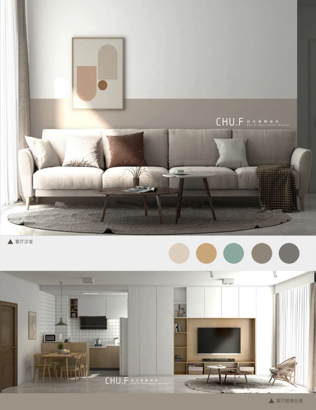 冰箱的上吊柜一直连接到客厅的电视柜,贯穿客厅和厨房。置顶落地电视柜,除了满足满满的收纳需求,还是一个多功能柜子,书籍陈列,装饰摆件收纳,满满都是生活气息。干净白色为主,木色为辅的搭配,丰富空间的层次感,没有复杂的线条,清爽整洁。